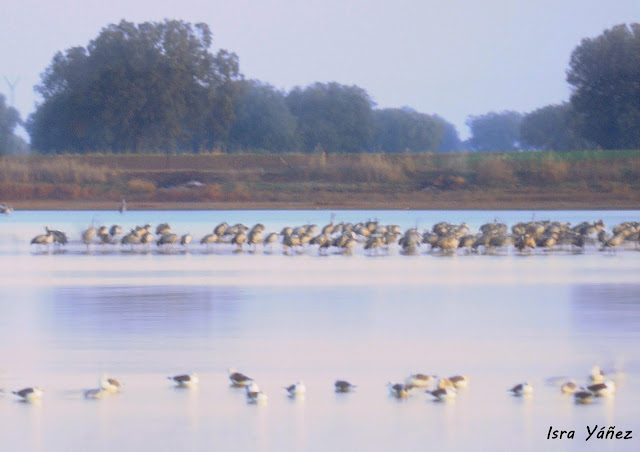 A parte de grullas, vimos un montón de cosas más así que es una entrada bastante larga y variopinta. Seguimos en la Laguna Grande de la Albuera, frecuentemente visitada por aguiluchos laguneros. También había otras especies de aves acuáticas y limícolas, como este grupito de agujas colinegras: